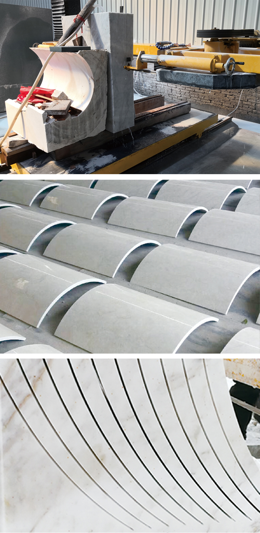 本機(jī)采用數(shù)控控制,鋸條圍繞中心軸工作,荒料分片由臺(tái)車自動(dòng)進(jìn)給控制。該機(jī)器具有耗能少,鋸縫小(3mm鋸縫,節(jié)省荒料)、操作簡易、精確度高、效率高等特點(diǎn),最大加工直徑Φ600mm以上(含Φ600mm)都可切割,是加工大理石圓弧板的最佳選擇。