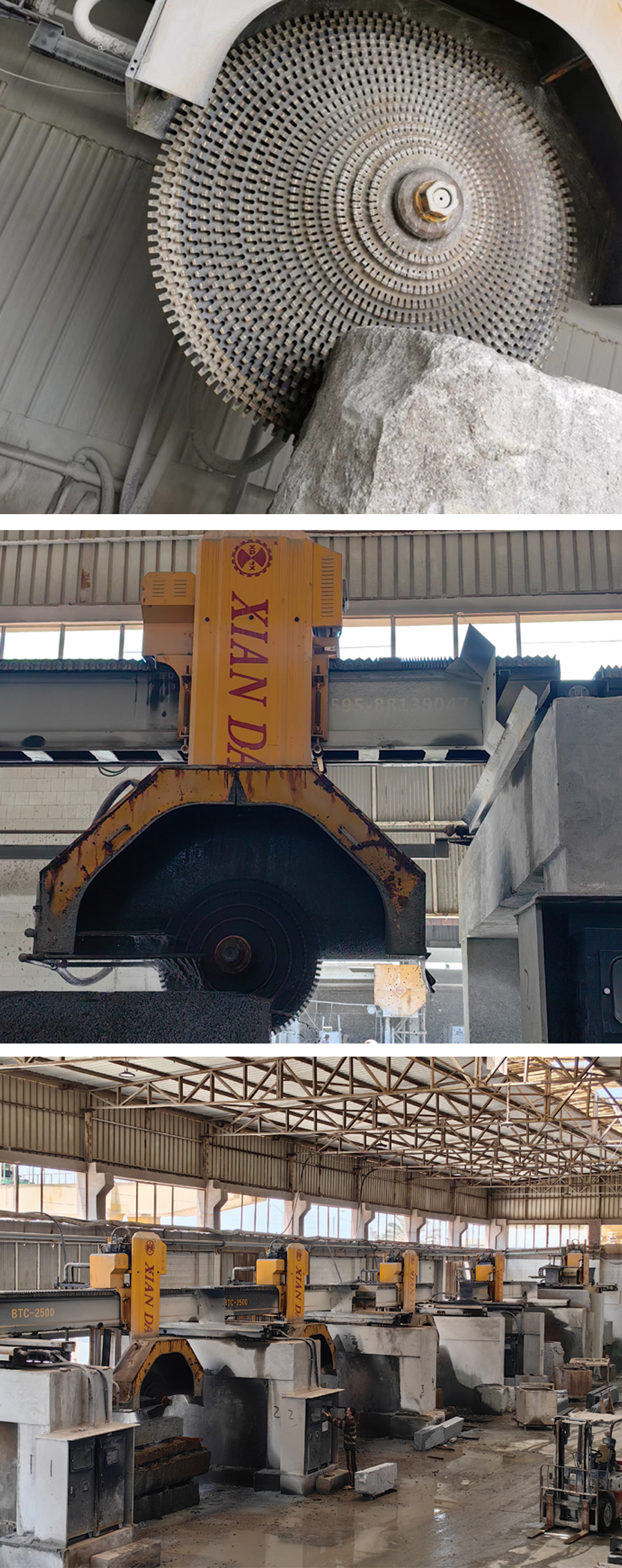 該機(jī)左右走刀采用變頻器控制,可根據(jù)石材材質(zhì)進(jìn)行調(diào)速,上下升降采用液壓升降,前后分片采用高精度絲桿螺母?jìng)鲃?dòng)、自動(dòng)分片,關(guān)鍵部位采用進(jìn)口優(yōu)質(zhì)零配件,荒料可直接置于地面,節(jié)省了臺(tái)車(chē)及其維護(hù)費(fèi)用;因而具有切割效率高、分片精度高、切割出來(lái)的板材平整度好,穩(wěn)定性高、操作簡(jiǎn)單等優(yōu)點(diǎn),特別適用于高價(jià)值花崗巖、大理石荒料的切割。