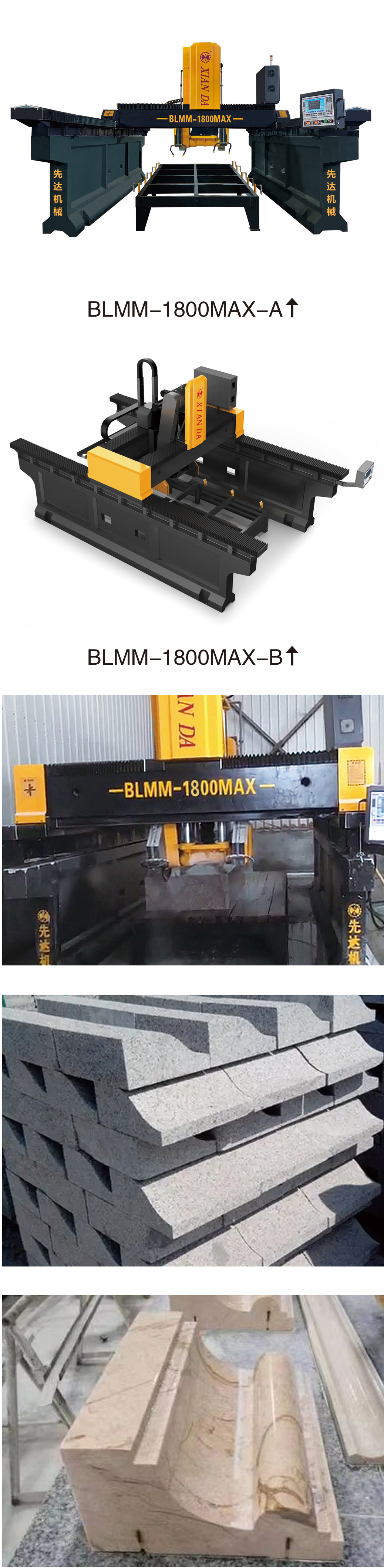 本機(jī)采用三軸數(shù)控系統(tǒng)控制,橋式雙梁結(jié)構(gòu),機(jī)頭升降采用四導(dǎo)柱+銅套結(jié)構(gòu),機(jī)頭左右行走采用直線導(dǎo)軌+頂輪結(jié)構(gòu),并結(jié)合直線導(dǎo)軌、滾珠絲桿的精度、仿型機(jī)的勁道,具有高行程、高效率、高穩(wěn)定性等優(yōu)勢,系統(tǒng)包含粗切、精切、精銑等功能,適用于大規(guī)格異形石材加工。