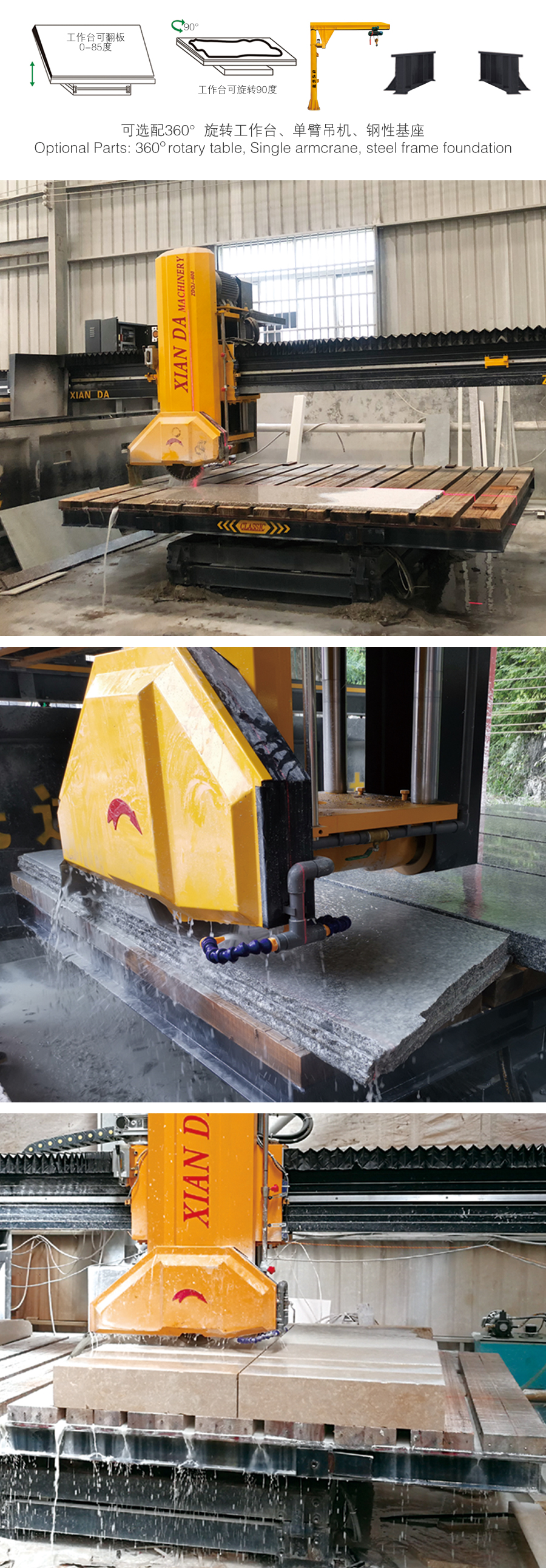 本機采用微電腦控制,工作臺可在水平面內(nèi)0,90°(可選配360°旋轉(zhuǎn)工作臺)定位旋轉(zhuǎn)。精密的制造組裝,以及特有的邊梁保護裝置,使其具有高精度、高穩(wěn)定性、高效率、操作簡易等特點。特別適用于大規(guī)格的花崗巖、大理石板材的加工。
