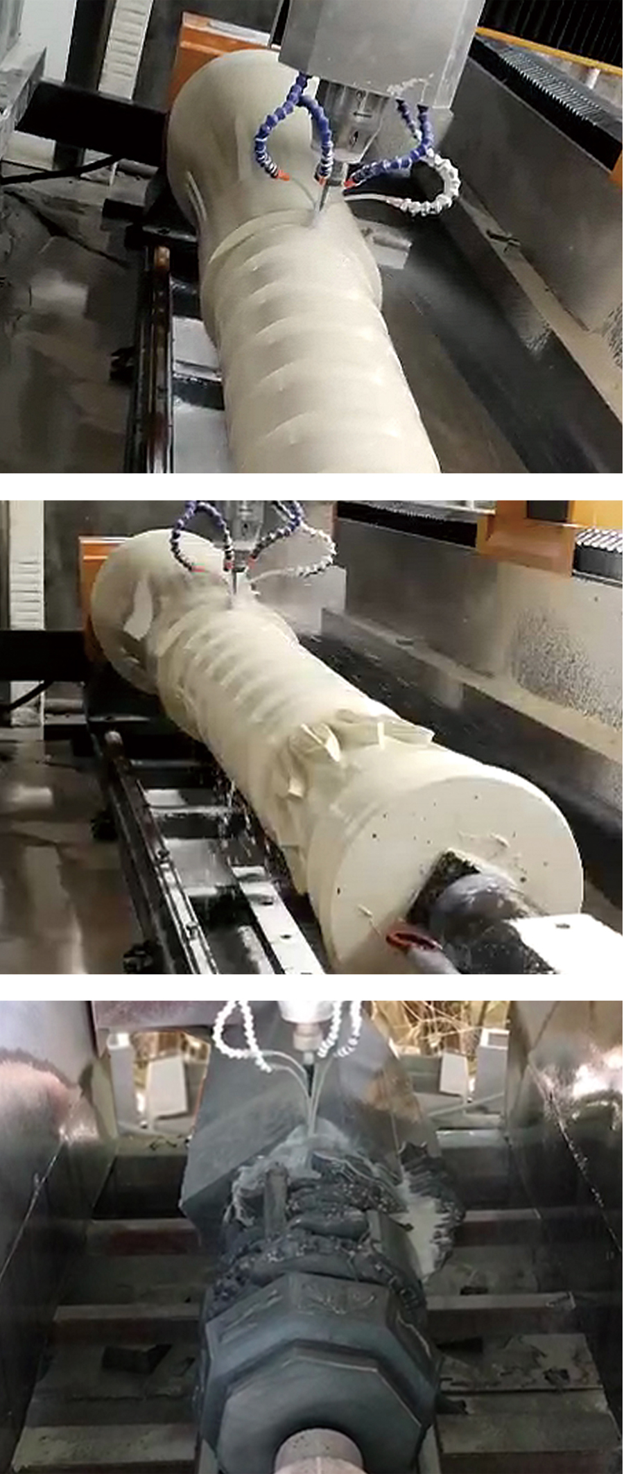 本機采用數(shù)控系統(tǒng)控制,四軸聯(lián)動,雙排四列滑塊,雙向刀具冷卻系統(tǒng),具有運行平穩(wěn)、精度高和效率高等優(yōu)點,適用于加工大理石、花崗巖、青石、玉石、瑪瑙等材料。